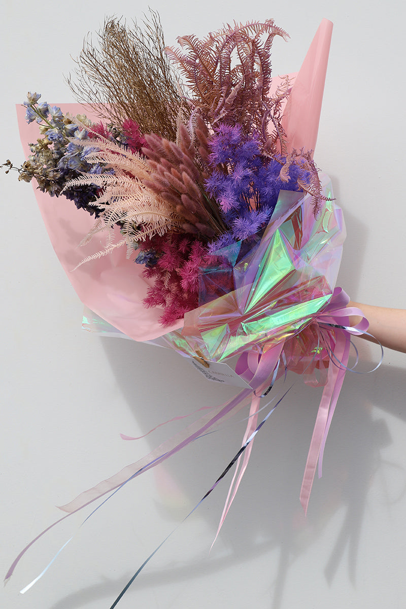 1st Styled Image: featuring our Iridescent Cello with our Matte Gloss Cello  +  Shot Organza Ribbon Italian Startex Ribbon  + Metallic Curling Ribbon  AND featuring our dried Bunny Tails + Metallic Sophia Descurainia + Pteris Fern sprayed with our Design Master Colour Tools