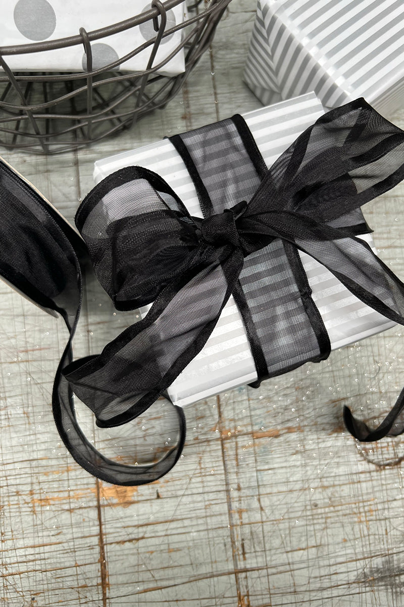 Styled Image: The Organza Satin Edged & Wired Edge Ribbon in Black is styled with the Thin Stripe Solar Wrap in Silver